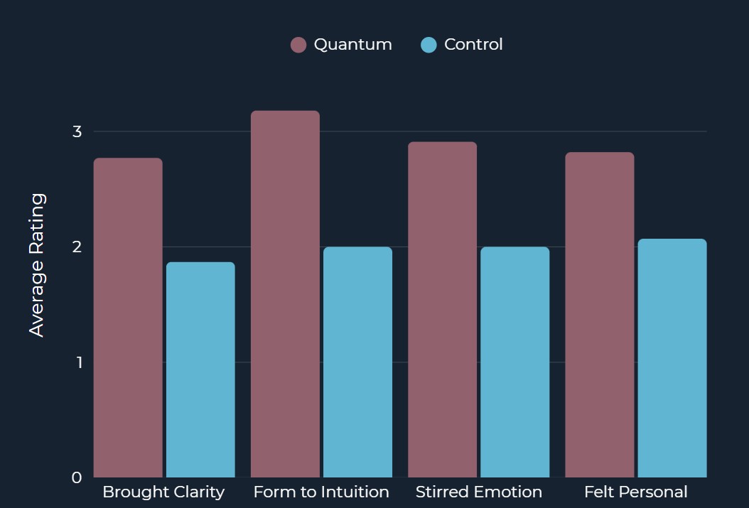 Participants rated quantum outputs +48% clearer, +59% more intuitive, +46% more emotionally stirring, and +36% more personal than controls.